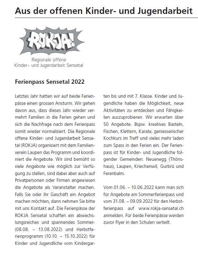 Die Regionale offene Kinder- und Jugendarbeit Sensetal ROKJA bietet Angebote für 6 bis 20-jährige, wobei der Hauptfokus auf das Alter zwischen 10 und 16 Jahre liegt.